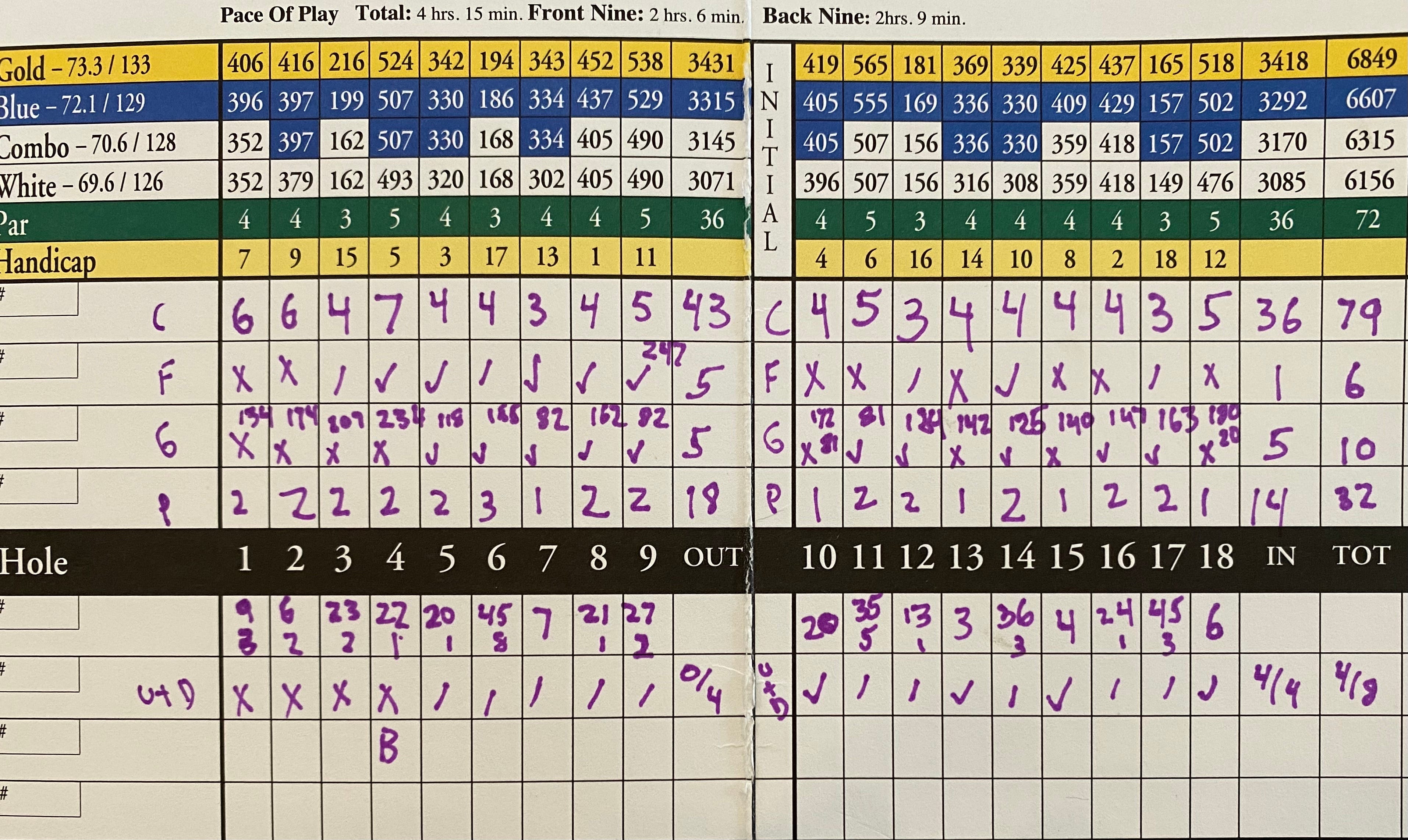 Sadly, they make you write down scores for all eighteen holes … and I had played the first four like a complete @ssh*le. When all was said and done, I shot 79. I was SEVEN over through the first four holes (yes, that is not a typo). I started off double-double-bogey-double to “jumpstart” my ascent to professional golf.